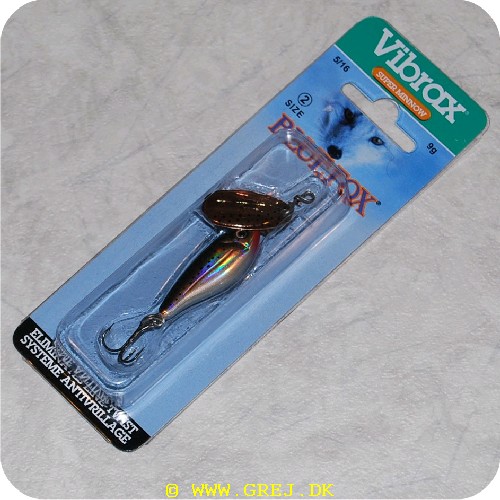 Minnow Super Vibrax - Kobberfarvet blad og fisk - Sorte prikker og sort ryg. "Verdens mest langkastende"