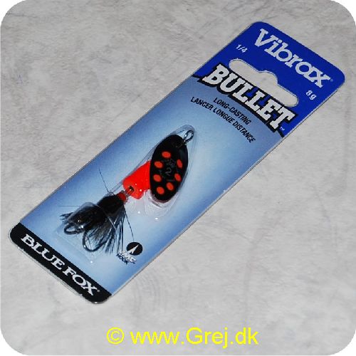 Beskrivelse:Vibrax Bullet Fly str. 2 - 8 gram - Sort blad m/røde pletter - Sort hår - Orange messing klokke - VMC trekrog - Langkastende