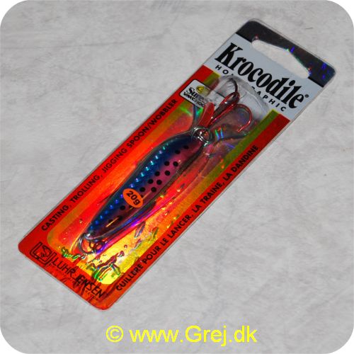Beskrivelse:Luhr-Jensen Krocodile holografisk - 20 g - Blå/sølv/pink med sorte pletter - 1 rød VMC trekrog påmonteret - 1 rød VMC enkelt krog medfølger