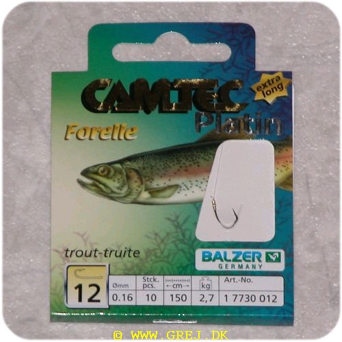 Camtec Platin ørredforfang - krog str. 12 -line 0.16 længde 150 cm - pakke med 10 stk