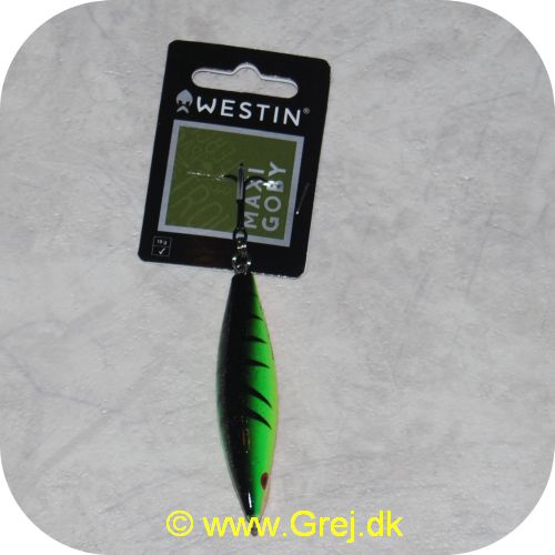 Beskrivelse:Westin Maxi Goby 18 gram/7 cm - Synkende - Firetiger - Grøn/gul/orange - ABS plastic - Dobbelte springringe - Ultra sonic raslekugler - #5 VMC 9649BN trekrog