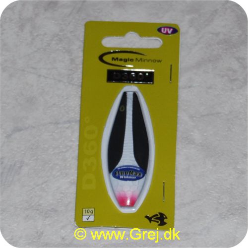 Magic Minnow D360 grader - UV hottie - 10 gram - Jing Jang - Materiale: Zink - Hvid/Sort/rød - 5.5 cm lang - Den har en irregulær aktion i vandet. som tiltrækker fiskene - lyser i vandet