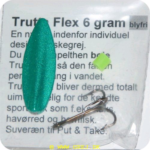 Beskrivelse:Trutta Flex - 6 gram - Grøn/Sølv En nyhed indenfor individuel designet fiskegrej. Du kan simpelthen BøJE Trutta Flex så den får den perfekte gang i vandet. Trutta Flex bliver dermed totalt uimodståelig for de kendte sportsfisk som f.eks. laks, havørred og hornfisk. Suveræn til Put & Take.